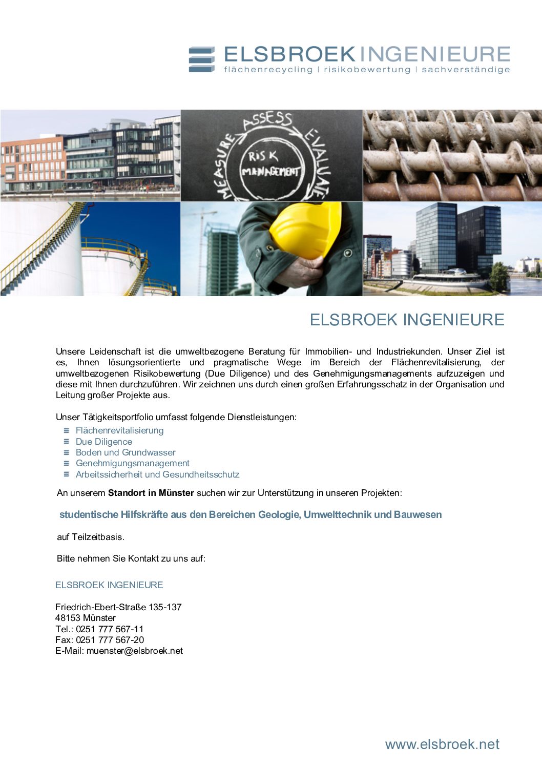 Seit 2013 am Markt, hat sich ELSBROEK INGENIEURE als fachlich versiertes Unternehmen rund um Flächenrevitalisierung, Risikobewertung (Due Diligence) und Genehmigungsmanagement fest etabliert. Der Kern unseres Erfolgs: Von unseren Standorten in Düsseldorf und Münster aus sind wir für Kunden aus dem gesamten Bundesgebiet tätig und entwickeln – von der Immobilienwirtschaft über Gewerbebetriebe bis hin zu Industrieunternehmen – pragmatische Lösungen, die sich durch ein optimales Kosten-Nutzen-Verhältnis auszeichnen.